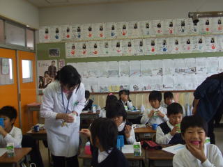 養護教諭の阿部先生に歯みがき指導をしていただきました。磨いているつもりでも、予想以上に歯によごれが残っていることを実感しているところです。毎日しっかり歯みがきをして、虫歯ゼロをめざしましょう。 ![]() |