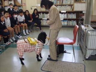 盲導犬ユーザーの北崎さんと盲導犬シルクちゃんが来てくれました。「ウエイト」が上手なシルクちゃんに、子どもたちは感激していました。 ![]() |